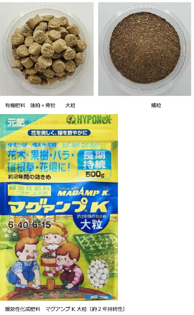 肥料は、基本は有機肥料の油粕や骨粉が混ざった物を使います。ニオイがでますから場所により使用が制限される場合は、超緩効性の化成肥料を使う事をお勧めします。
