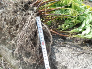 常緑性キリンソウ「四季彩4」 種苗登録認定 特性解説 第4回 根が露出し裸の状態で、酷暑・防風・豪雨にさす耐久試験