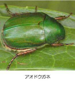 コガネムシの中でも被害が多いアオドウガネは成虫の体長は約20mm、光沢のある緑色が特徴の多く被害を出し、他のコガネムシ類も食害を発生します。