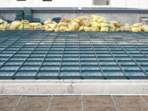 緑化ユニット施工では、ユニットは水路兼防根トレーの上に配置するので防根シートは設置しない。