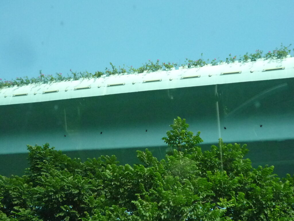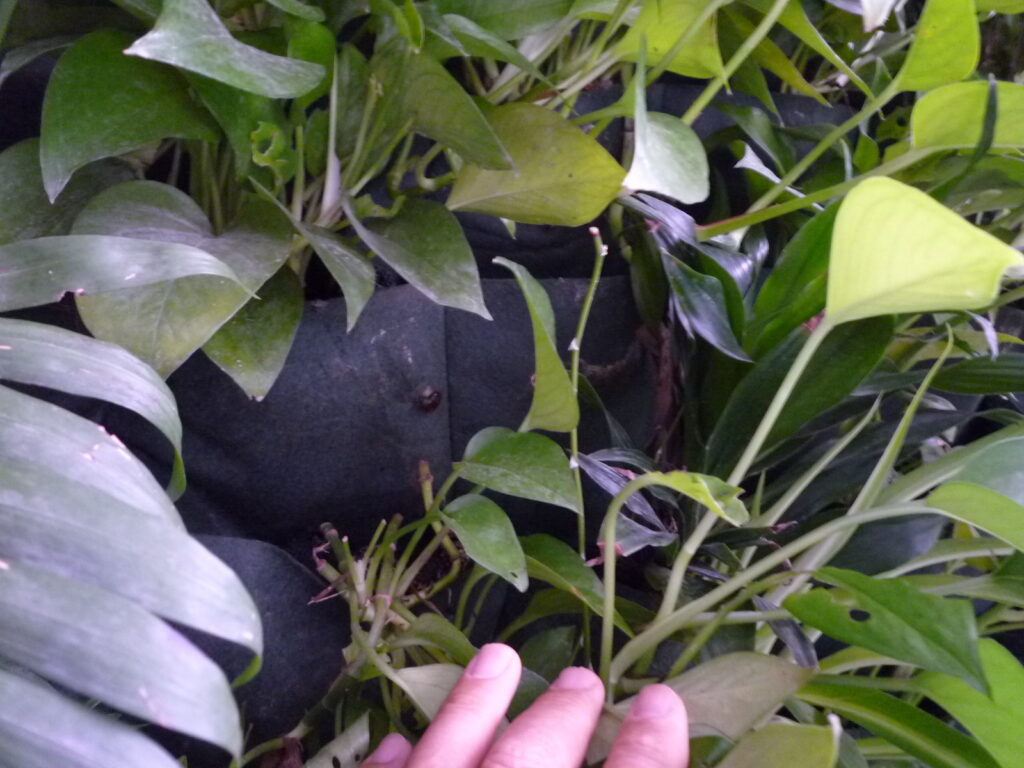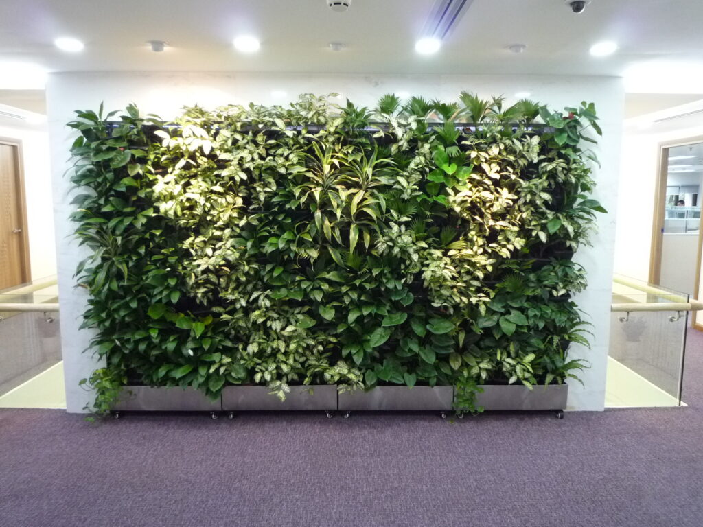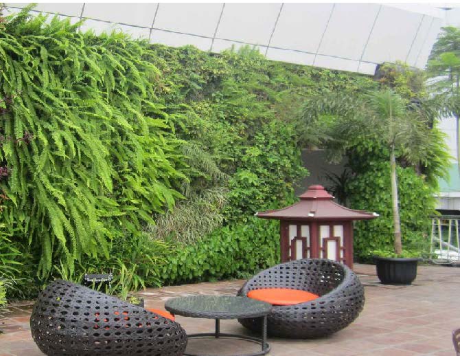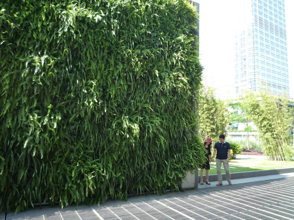 植物種は日本の壁面緑化品種と同じでセキショウ、ラン類、シダ類、アベリアホープレイズ等の