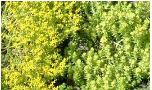 左側:標準メキシコマンネングサ 開花中、草丈が伸び花序の重さで倒伏する。