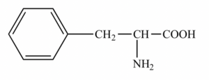 フェニールアラニンとはアミノ酸の一種で、側鎖にベンジル基を持つ。略号は Phe または Fアラニンの側鎖の水素原子が1つフェニル基で置き換えられた構造を持つ非極性側鎖アミノ酸で、芳香族アミノ酸