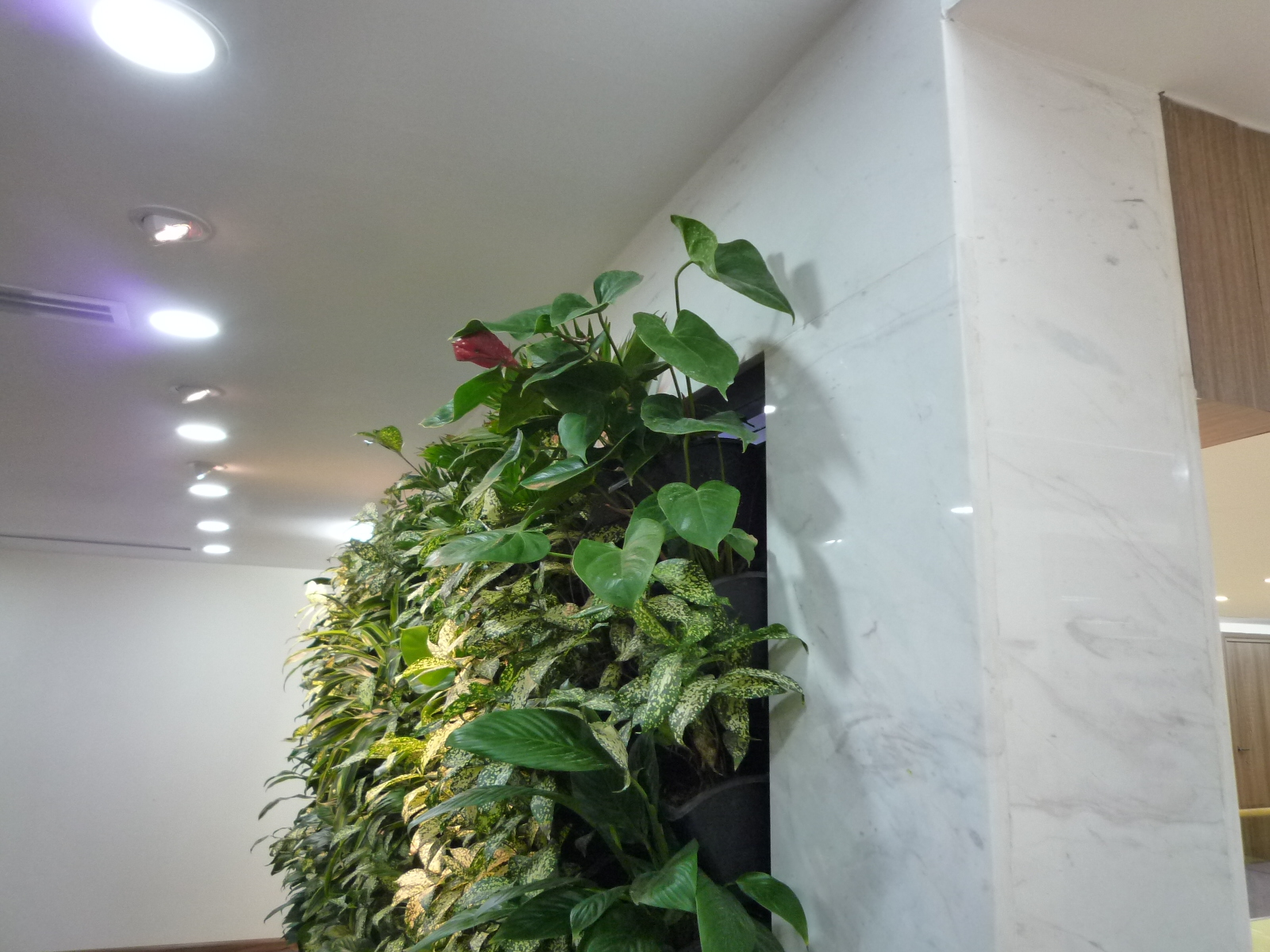 現在実施されている室内緑化は人工照明+循環式給水システムの壁面緑化プランターを取り入れた緑化と、壁面緑化のデメリットを解消するためにフェイク植物を利用した緑化のやり方が壁面緑化の新しいデザインとして実用化されている。