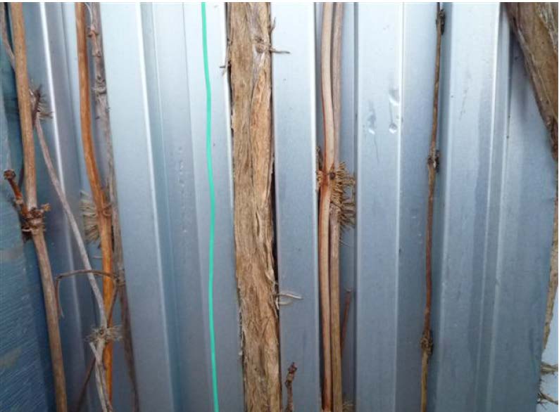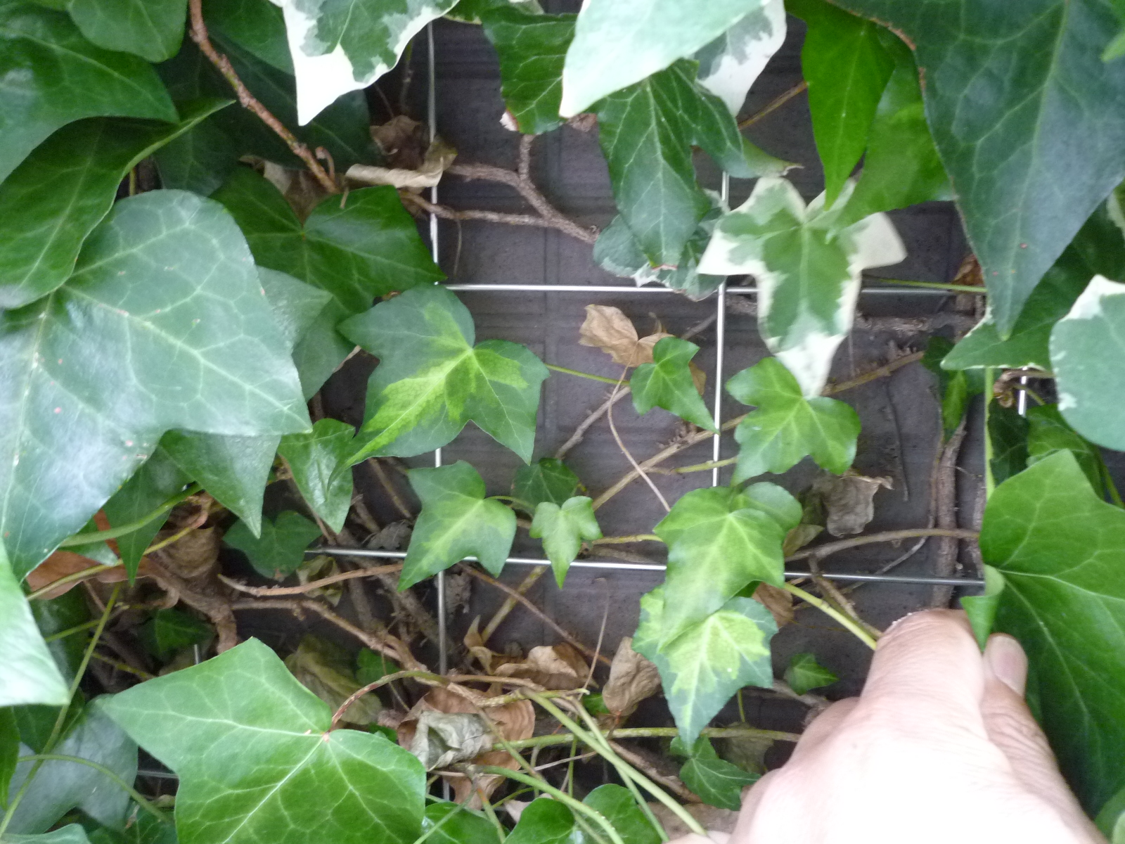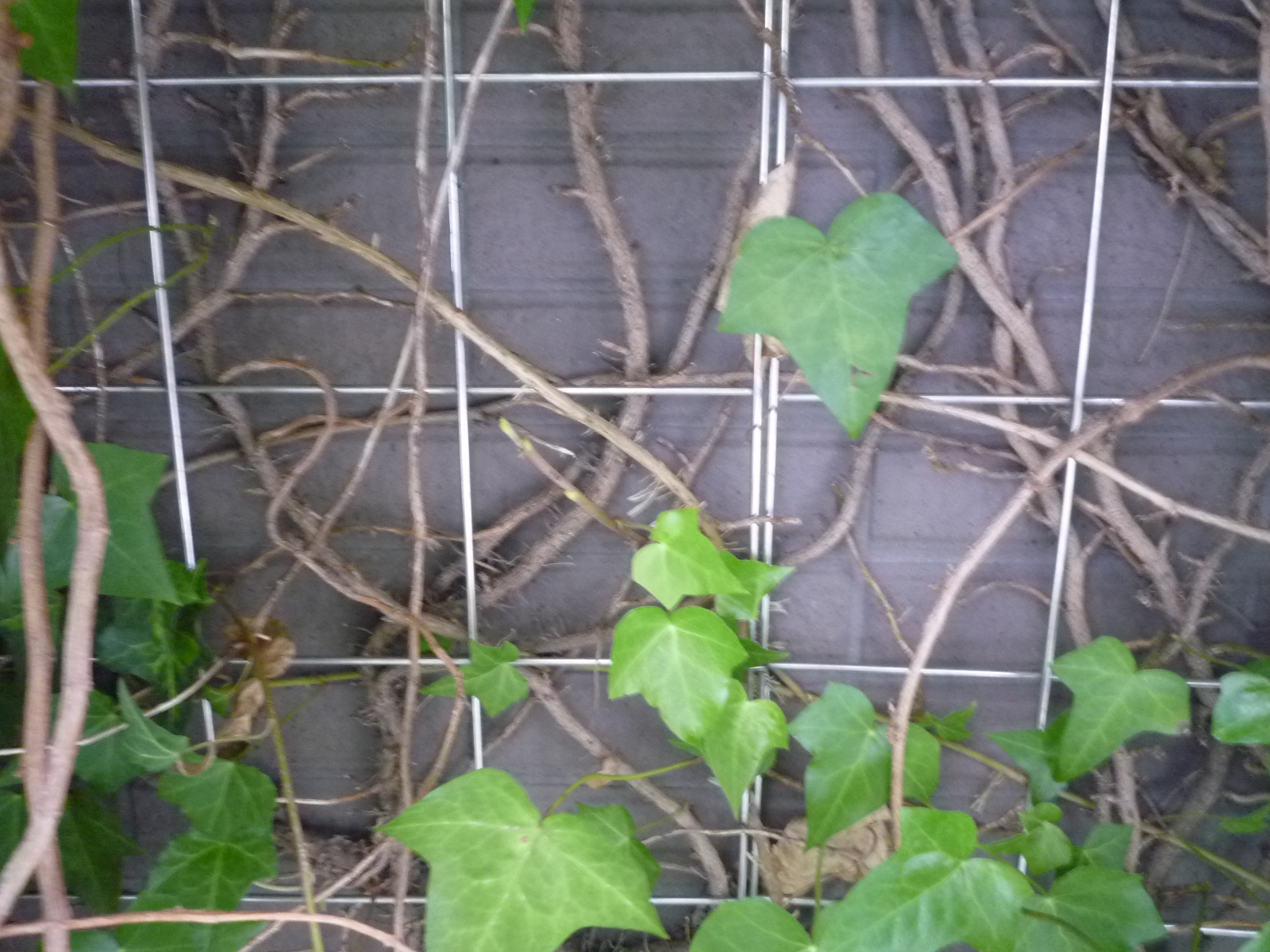 壁面緑化では機材を壁面より10cm 程度離して設置するが、この間隔が狭いと、ヘデラ類などの茎が太る種ではワイヤーメッシュの表側より裏の壁面側に枝を張る事が多い。これは新芽の成長が狭い空間などで絡んで成長しやすい点と、維持管理で表面側を刈込むことで背面の芽に栄養分が回され成長が促される点にある。背面に繁茂が進むと、交差した太った枝がワイヤーメッシュを押し上げアンカーピンが抜けたり、圧力で周辺にたわみが出来たり隙間ができたりします。