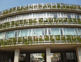 - プランターを敷き詰めてデザイン性のある壁面緑化を実現